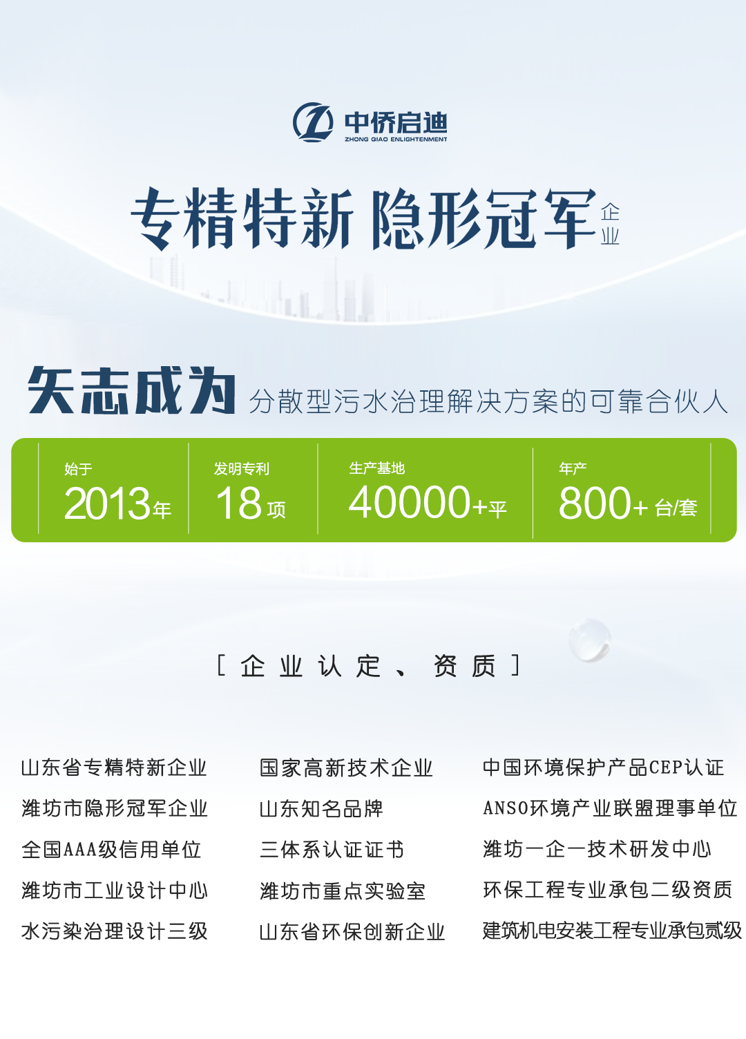 | 核心设备 | 8 套中侨启迪 QDPP 一体化污水处理设备,单套额定处理量 250m³/d,采用 PP 一体成型罐体,抗腐蚀、寿命长 |
